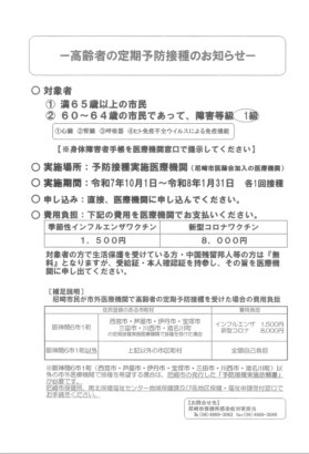 10月1日より高齢者(65歳以上)の定期予防接種(季節性インフルエンザ、新型コロナ)が始まります。